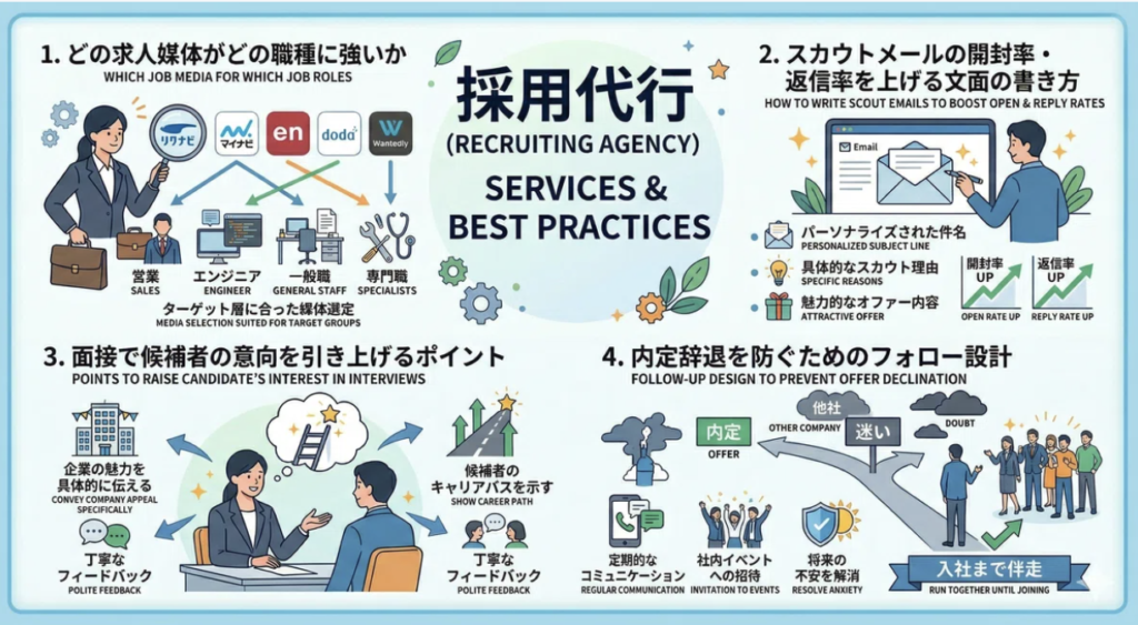 採用代行は、戦略の提案だけでなく「実行」まで一気通貫で担います。人事リソースが限られた中小企業にとっては、「やるべきことはわかったけれど、誰がやるのか」という課題を解消できる点が大きな違いです。