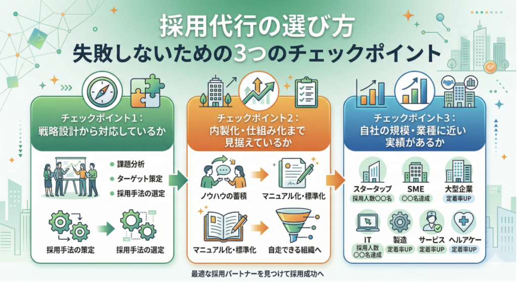 採用代行を選ぶ際は、「戦略設計からの対応」「内製化の視点」「自社に近い実績」の3つのチェックポイントを確認してください。
