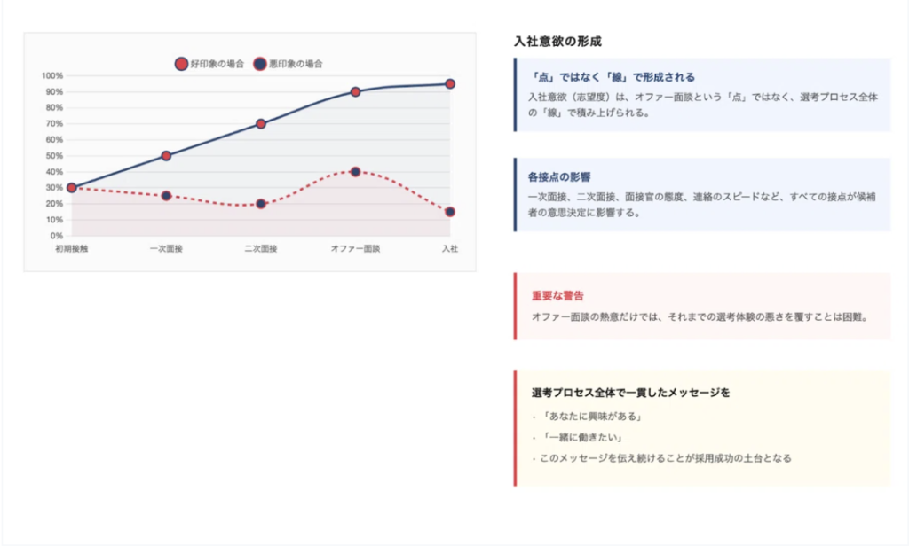 「この会社で働きたい!」という入社意欲(=志望度)は、オファー面談という「点」で生まれるのではなく、候補者が会社と接触するすべての「選考体験」という“線”で積み上げられていくものなんです。
