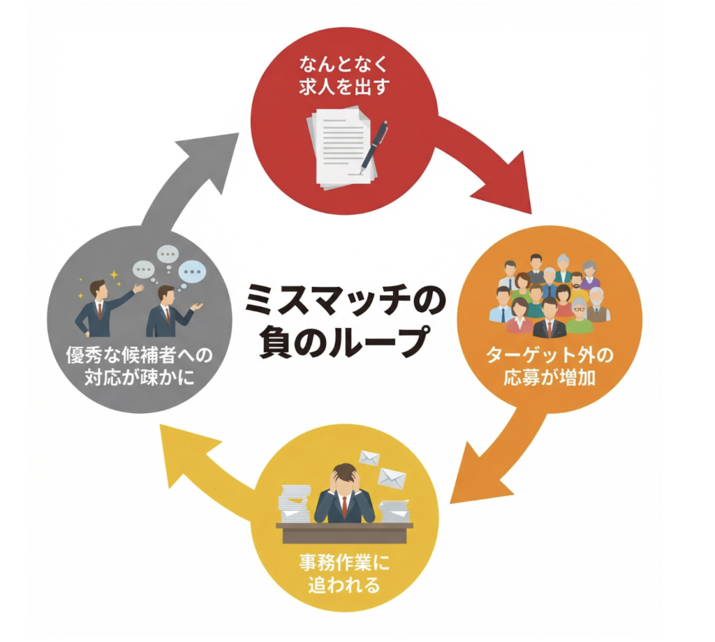 • 「なんとなく」が招くミスマッチ:スキル要件だけを並べた求人票は、誰の心にも刺さりません。結果として、とりあえず応募してくる層だけが集まってしまいます。