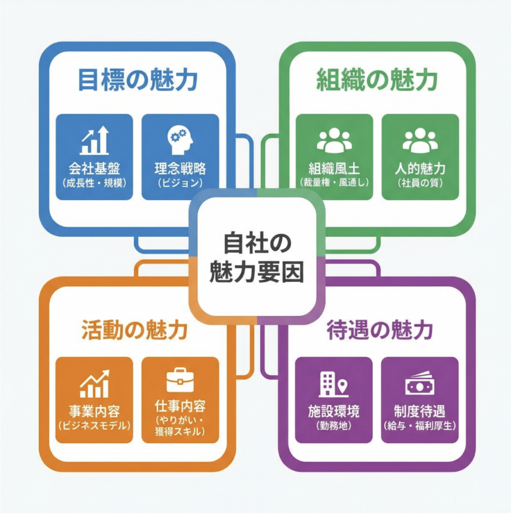 まずは、自社が持つ魅力を以下の4大項目・8つの因子で棚卸ししましょう。
