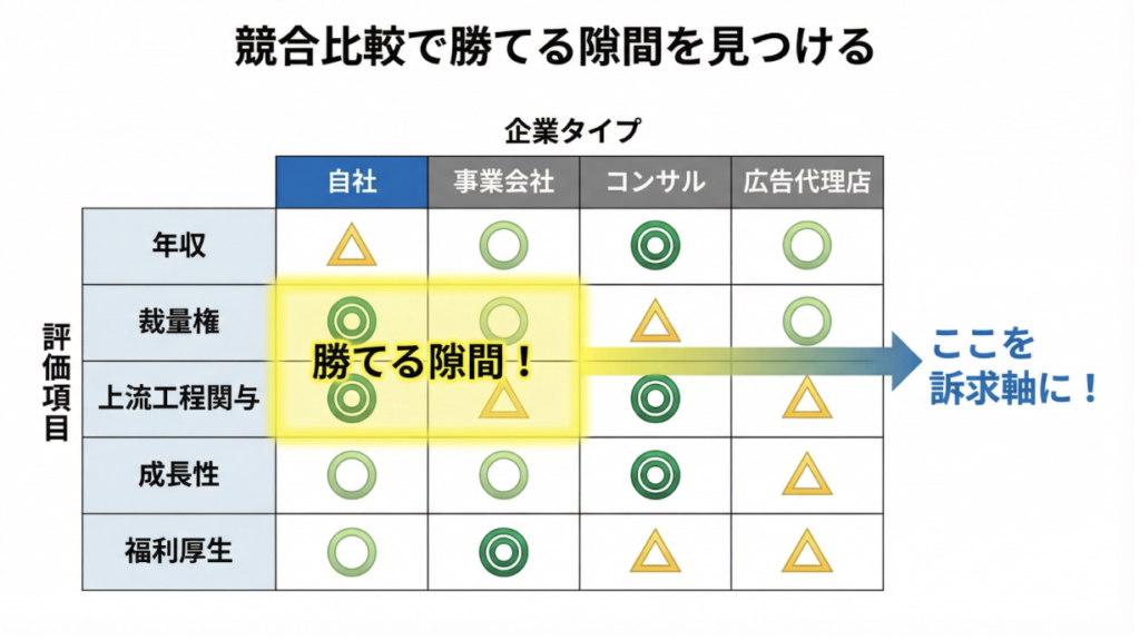 • 「勝てる訴求軸」を特定する:例えば「年収」で負けていても、「若手の裁量の大きさ」や「上流工程から関われる点」で◎がつくなら、そこが狙い目の「隙間」になります。