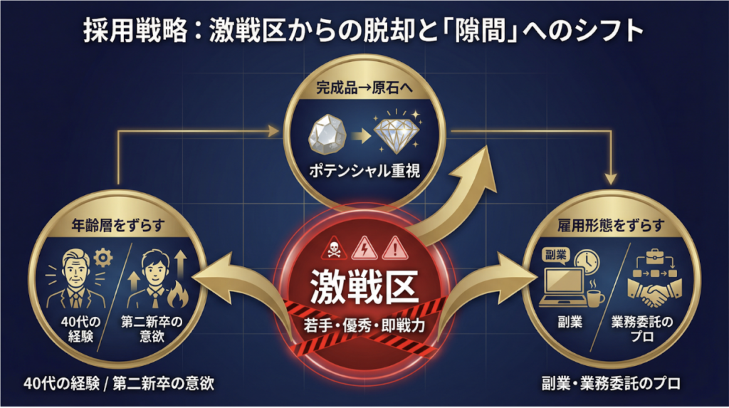 2. ターゲットを「ずらす」: 「ポテンシャル枠」「年齢層の拡大」など、競合がいない「スキマ」を設定する。