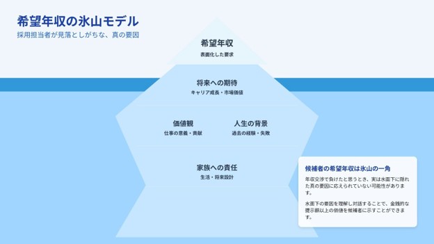 候補者の希望年収は、氷山の一角にすぎません。その水面下には、彼らが生きてきた人生、これから実現したい夢、守りたい家族との生活など、無数の文脈が隠されています。あなたの会社が提示できる「お金以外の報酬」とは、この水面下の部分に深く、鋭く突き刺さる「価値」のことなのです。