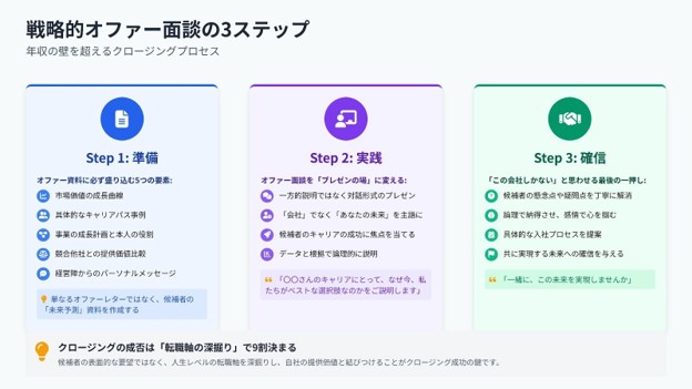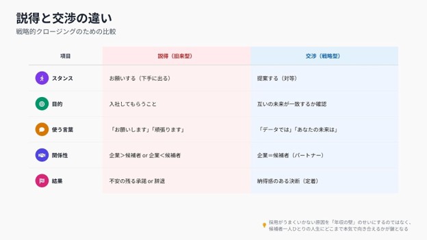 必要なのは、資金力ではなく、候補者一人ひとりの人生にどこまで本気で向き合えるか、という覚悟です。その覚悟を、論理とデータで形にする技術こそが【戦略的クロージング術】です。