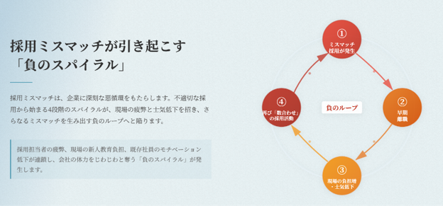 採用担当者は疲弊し、現場は新人の教育と欠員補充に追われ、既存社員のモチベーションまで下がっていく。まさに、会社の体力をじわじわと奪う「負のスパイラル」なのです。