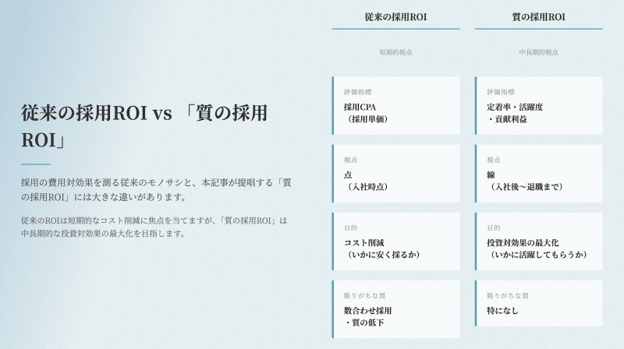 私たちが本当に注目すべきは、「質の採用ROI」です。