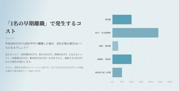 しかし、本当に恐ろしいのは、ミスマッチによる早期離職が発生した際の「見えないコスト」です。