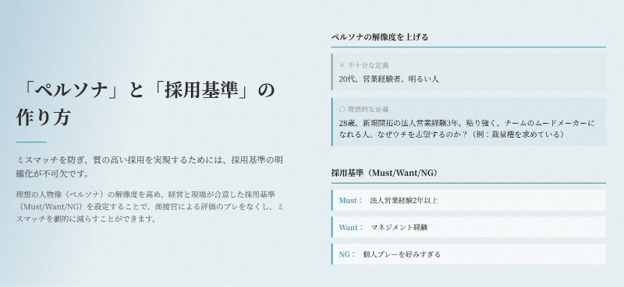 - 経営と現場を巻き込み「採用基準」を再定義する 「Must/Want/NG」を明確にし、採用の「ズレ」をなくします。