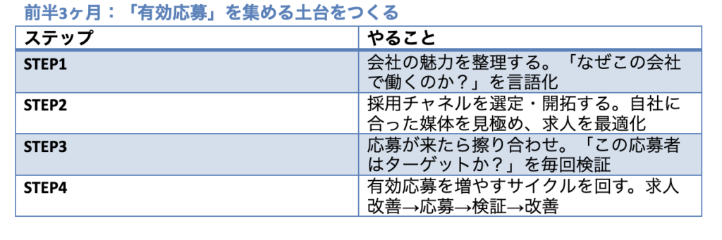 この3ヶ月で「応募が来る状態」をつくります。ただ来るだけじゃなく、会いたい人が来る状態に持っていく。